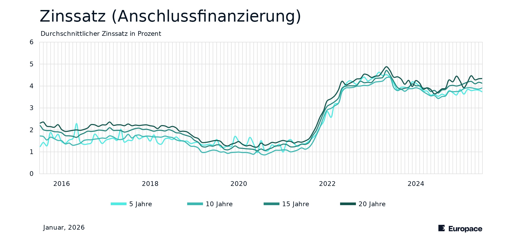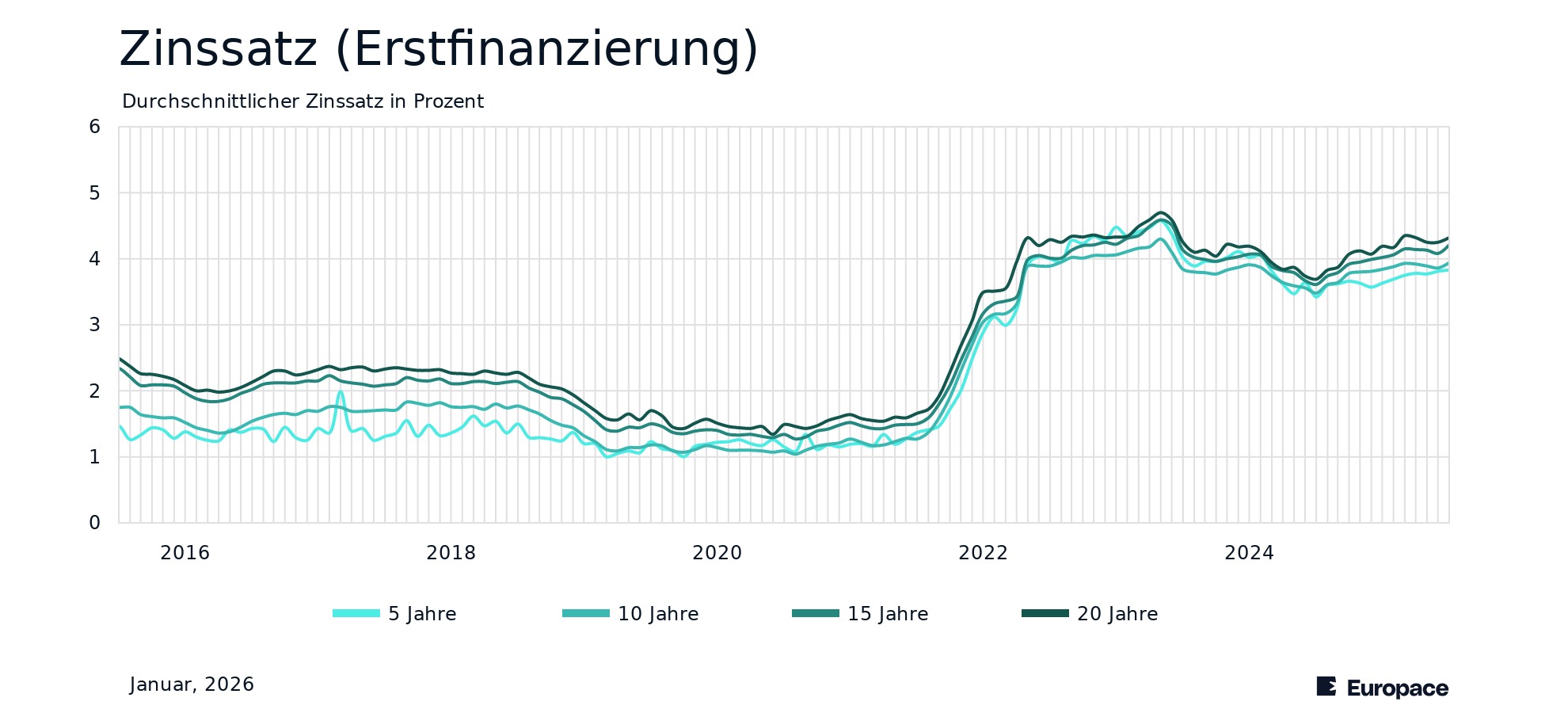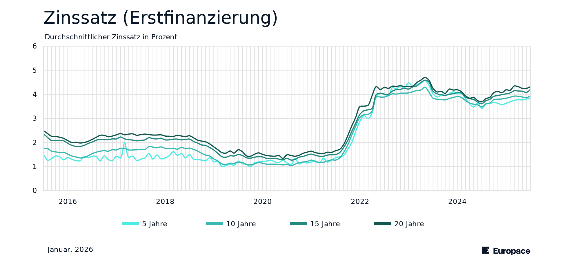Der Zinssatz gibt an, welchen Zins ein Kreditinstitut beim Abschluss eines Darlehens verlangt. Unsere Zahlen zeigen den Effektivzins. Grundlage für die Berechnung sind Zinsbindungen von 5, 10, 15 und 20 Jahren. Es werden einfache Annuitäten-Darlehen und solche in Kombination mit KfW-Darlehen berücksichtigt. Wenige oder fehlende Datenpunkte bei spezifischen Zinsbindungsdauern entstehen durch seltene Finanzierungsszenarien und können zu Unregelmäßigkeiten in den Ergebnissen führen. Neben Erst- und Anschlussfinanzierung werden unter allen Finanzierungen auch zusätzliche Finanzierungsarten wie Modernisierung berücksichtigt. Die Veränderung zum Vormonat und Vorjahr wird in Prozentpunkten angegeben. Die Aktualisierung erfolgt monatlich. Datenstand: Januar, 2026